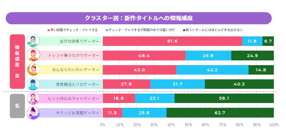 新作タイトルへの情報感度は二分化傾向があります。“全方位欲張りゲーマー”が最も新作タイトルに敏感で、“トレンド乗りたがりゲーマー” “みんなとわいわいゲーマー”が続く。一方、 “ヒット作のみライトゲーマー”・“サクッとお気軽ゲーマー”の半数以上はそもそも新作ゲームに興味を示さない結果に。