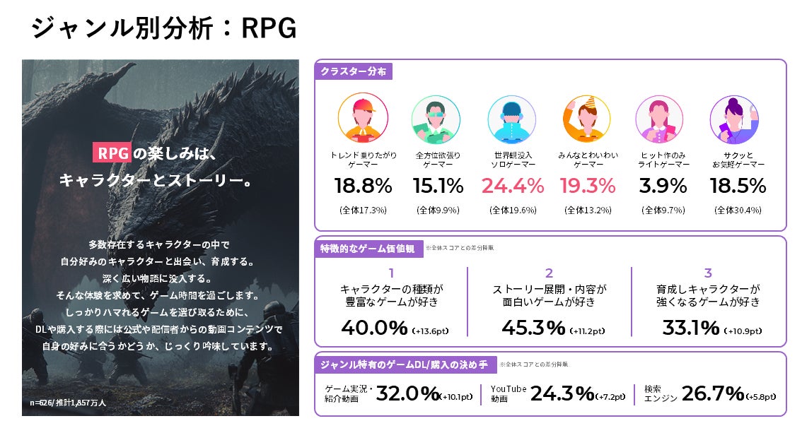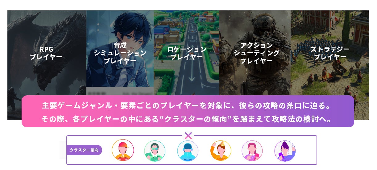 ・主要ゲームジャンル(5つ)・要素ごとのプレイヤーを対象に、彼らの攻略の糸口に迫り、各プレイヤーの中にある“クラスターの傾向”を踏まえて攻略法の検討を実施。