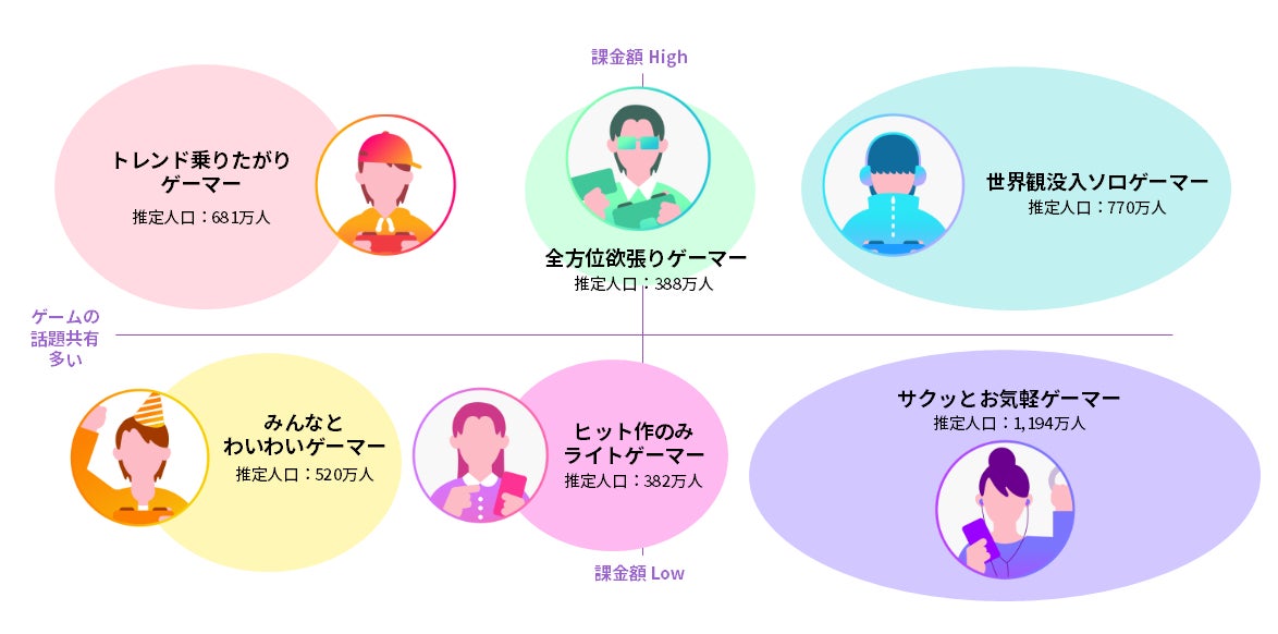 ゲームプレイヤーを6つのクラスターに分類し、それぞれ異なる価値観や特徴を捉えました。