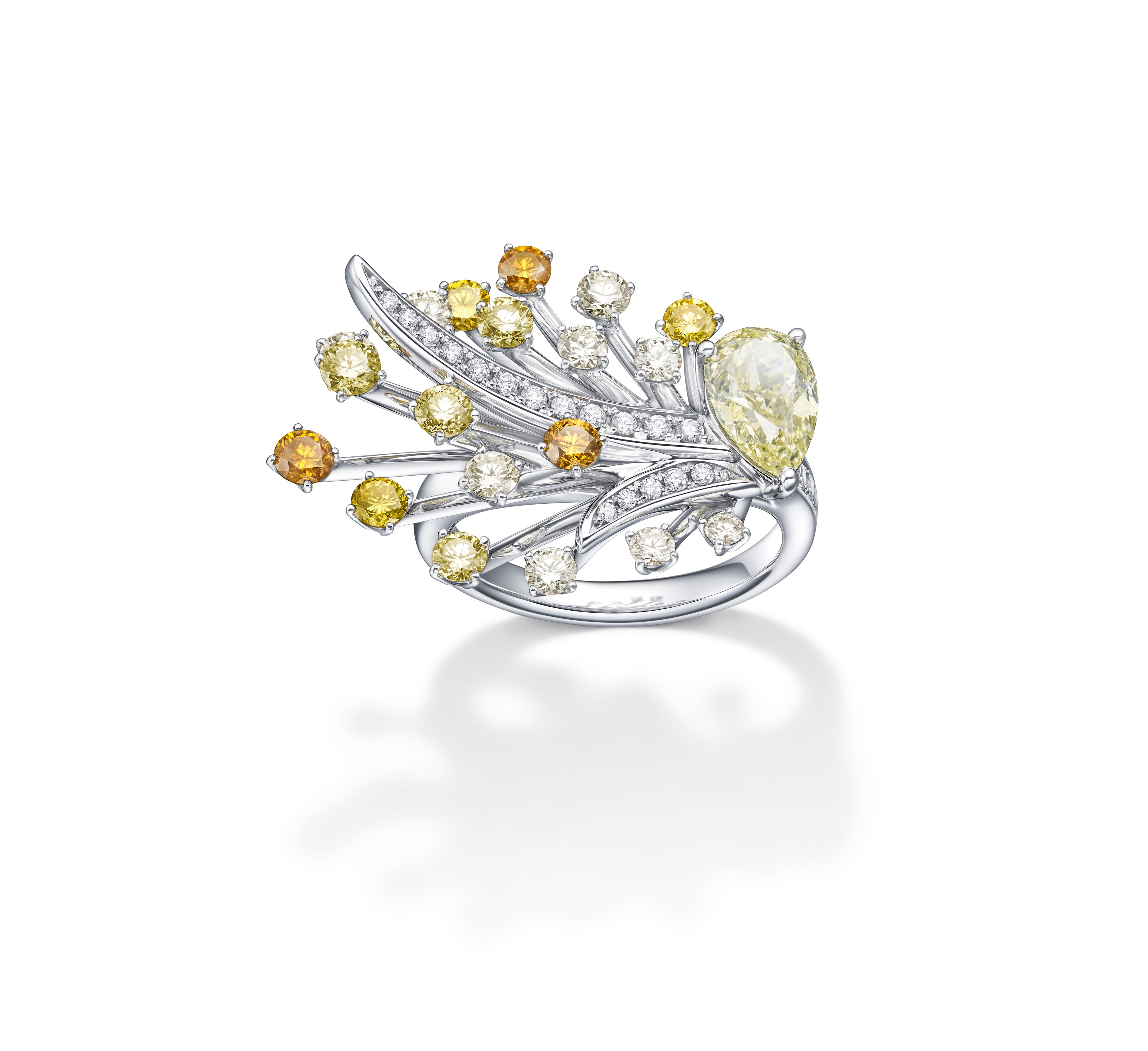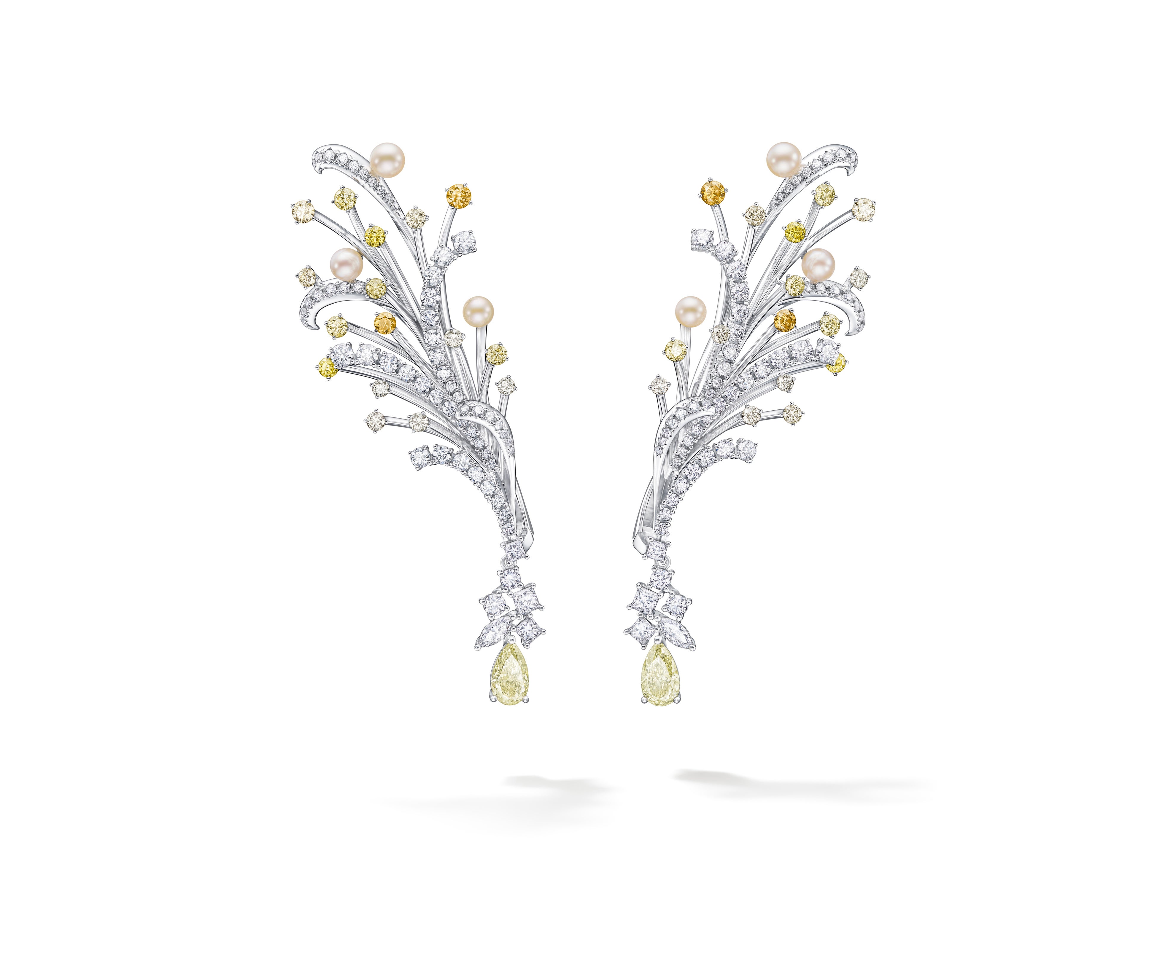 時代を越えて色褪せることなく引き継がれていく、リッツ パリの創業者であるセザール・リッツの精神をしなやかに伸びるメタルとダイヤモンドのラインで表現し、眩い炎に照らされしぶきを上げて煌めく噴水の光景を、あこや真珠や稀少なマルチカラーカラーダイヤモンドで繊細に描いたジュエリーです。