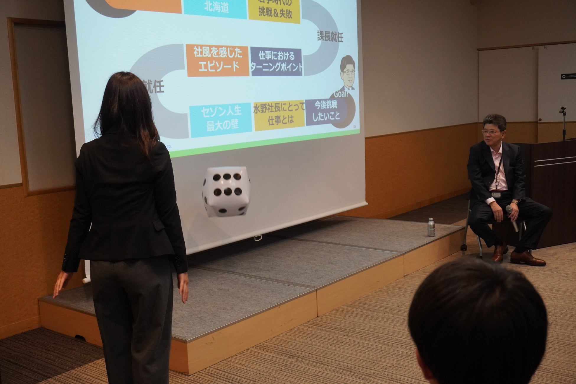 新入社員がサイコロを振り出た目のテーマに水野が答えていきました。新入社員時代のエピソードや仕事におけるターニングポイント、今まで仕事をしてきた中での壁などについて伝えました。水野からは「仕事は自己成長のきっかけをくれるもの、積極性を持って取り組んでみてほしい。また自己成長は人生を豊かにする1つの手法であるので、尻込みせずに前に進んでいってほしい」と新入社員にメッセージを送りました。