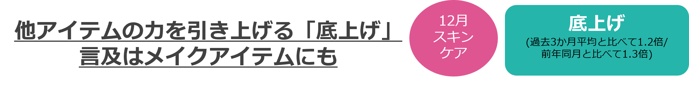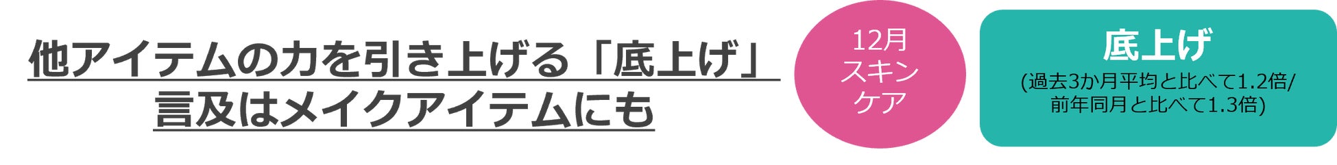 12月、各所でベストコスメが発表されたことに伴い、クチコミでは「マイベストコスメ」というワードが増加しました。その他にも「全人類(に使ってほしい)」、「布教する」、「名品」といったワードも増加しており、自分のよいと思った商品を他者に推奨する動きがみられました。