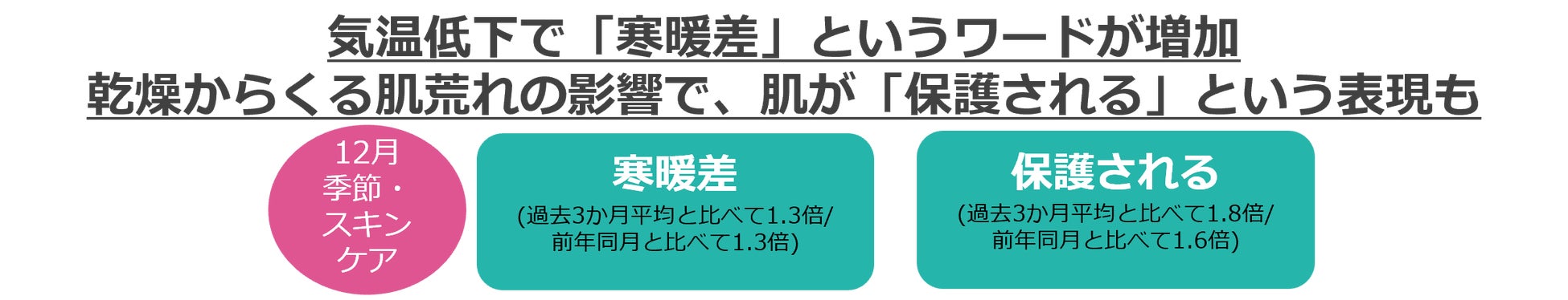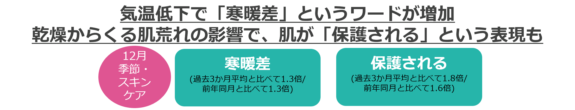 ・気温低下で「寒暖差」というワードが増加!乾燥からくる肌荒れの影響で、肌が「保護される」という表現も