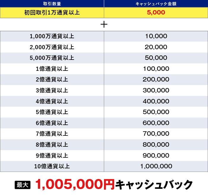 7月に新しく口座開設いただいたお客さまを対象に、初回お取引1万通貨以上でもれなく5,000円をキャッシュバック、さらに期間中のお取引数量に応じて、最大100万円をキャッシュバックいたします。