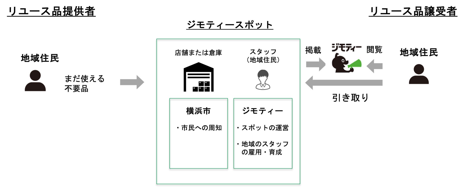 ジモティースポットは、「不要になったけれどもまだ使えるモノ」を地域のコミュニティ内で有償または無償で譲り合うことが出来るサービスです。持ち込み希望の方は、ジモティースポットに持ち込むだけで、手軽に必要とする人に譲渡することができます。そして、譲り受け希望の方は、持ち込まれたモノの情報をジモティーで検索し、ジモティースポットで引き取ることでマッチングが成立する仕組みとなっています。