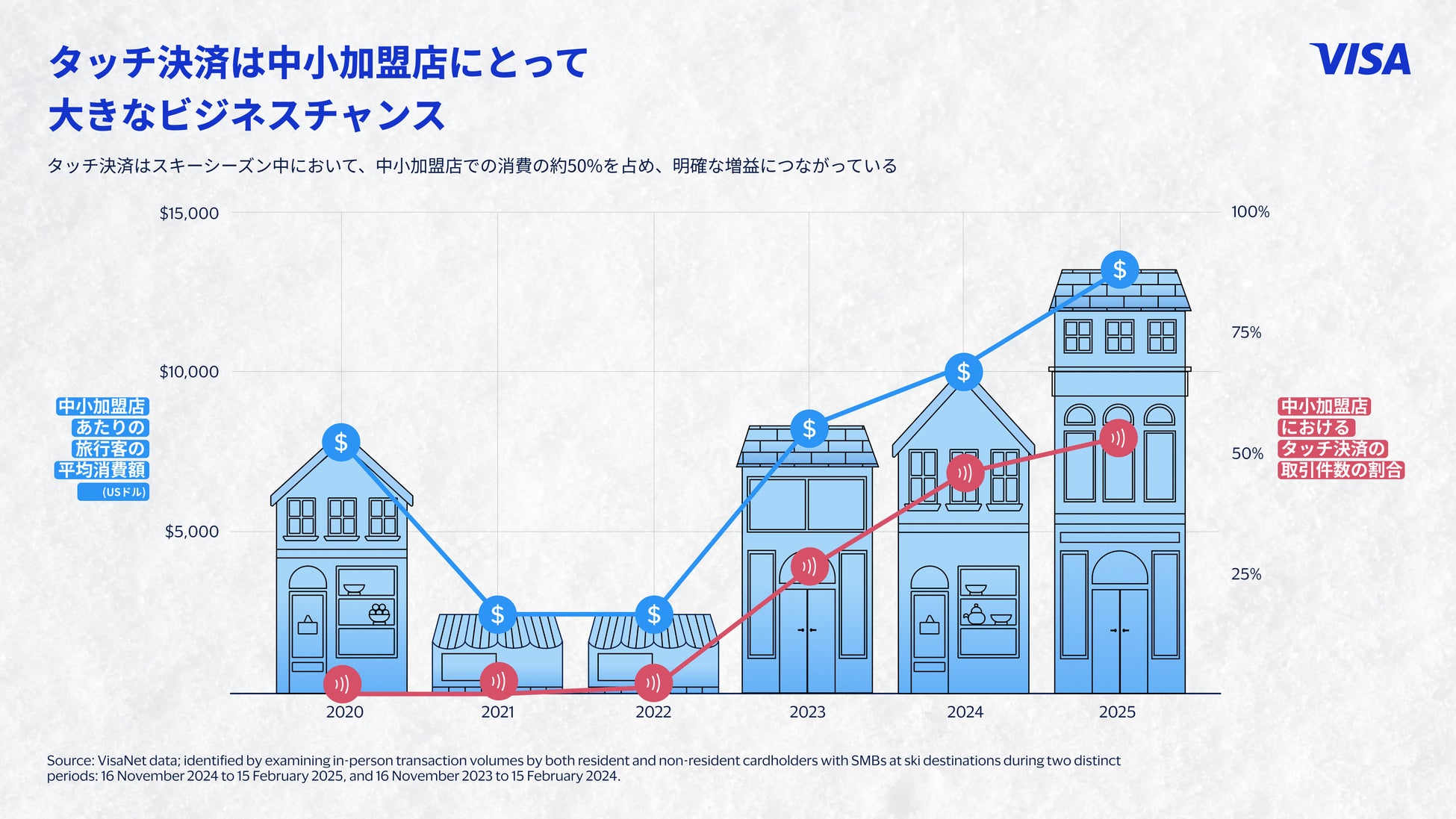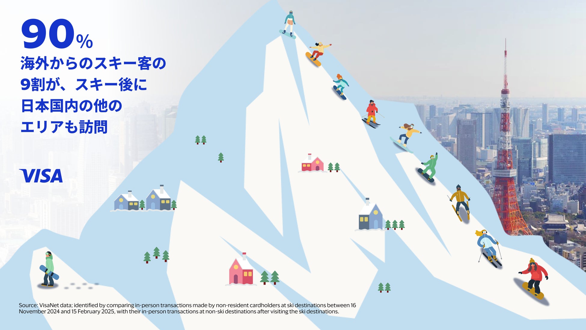 *3 2024年11月16日から2025年2月15日と2023年11月16日から2024年2月15日の2つの異なる期間にスキー観光地で対面取引を行った、国内居住Visaカード保有者と非居住Visaカード保有者の両方を比較することにより特定。国内居住Visaカード保有者の場合、過去6か月間に同じスキー観光地で取引をしていない人のみを含む。