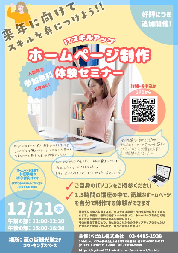 【参加受付中】栃木市でホームページ制作体験セミナーを無料開催 12/21(木) 〜地方で育児中の女性のリスキリングのきっかけとしてベビカムが主催〜