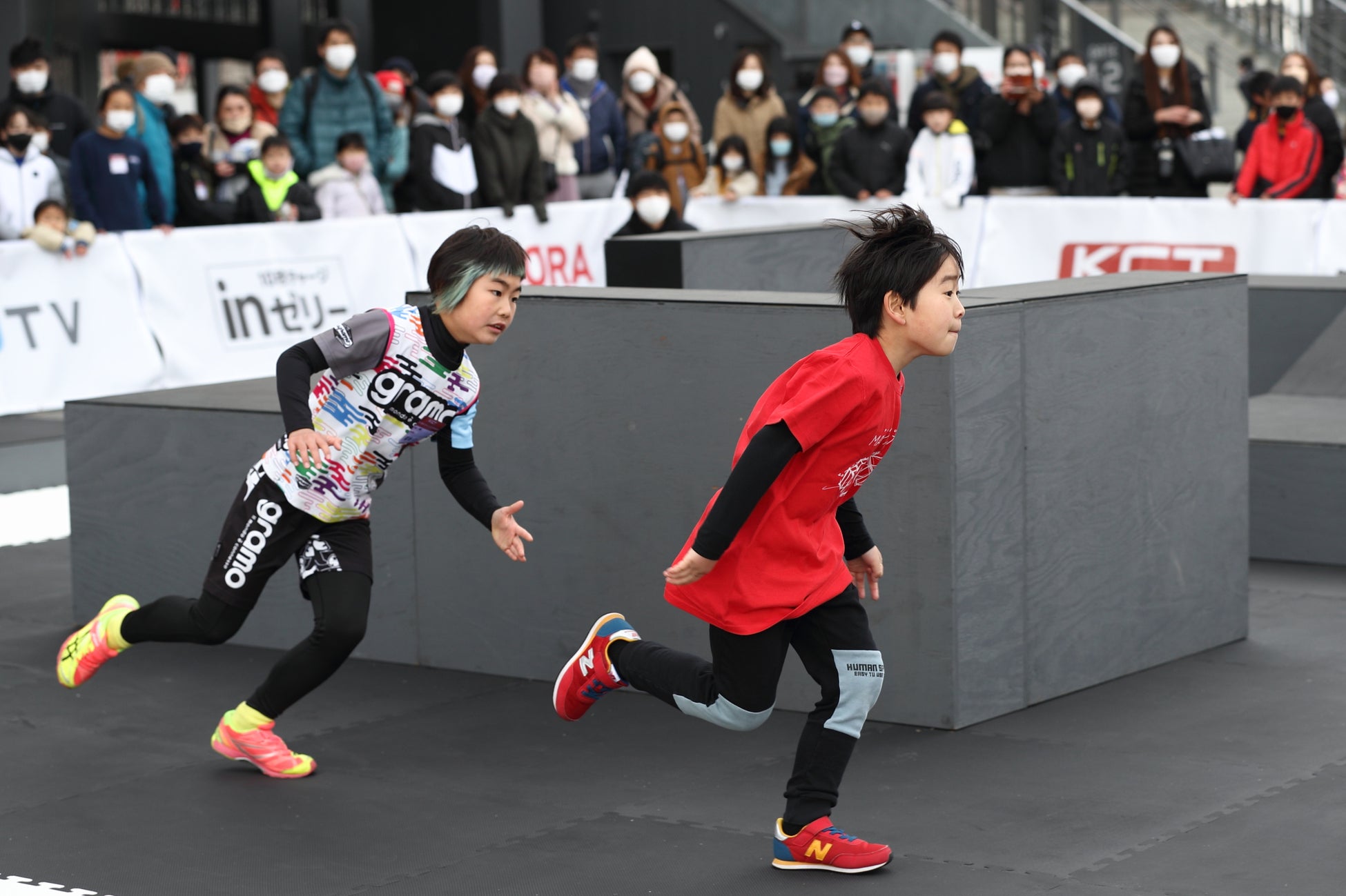 安全面を配慮し運動機能を自然と向上させるよう設計されたキッズ用障害物のある指定エリアの中で、選手たちが1対1で「パルクール鬼ごっこ」をする、いわば究極の遊びのスポーツ化。20秒ごとに「追う側」「追われる側」に攻守交替し、どちらがより早く相手をつかまえられるか競います。