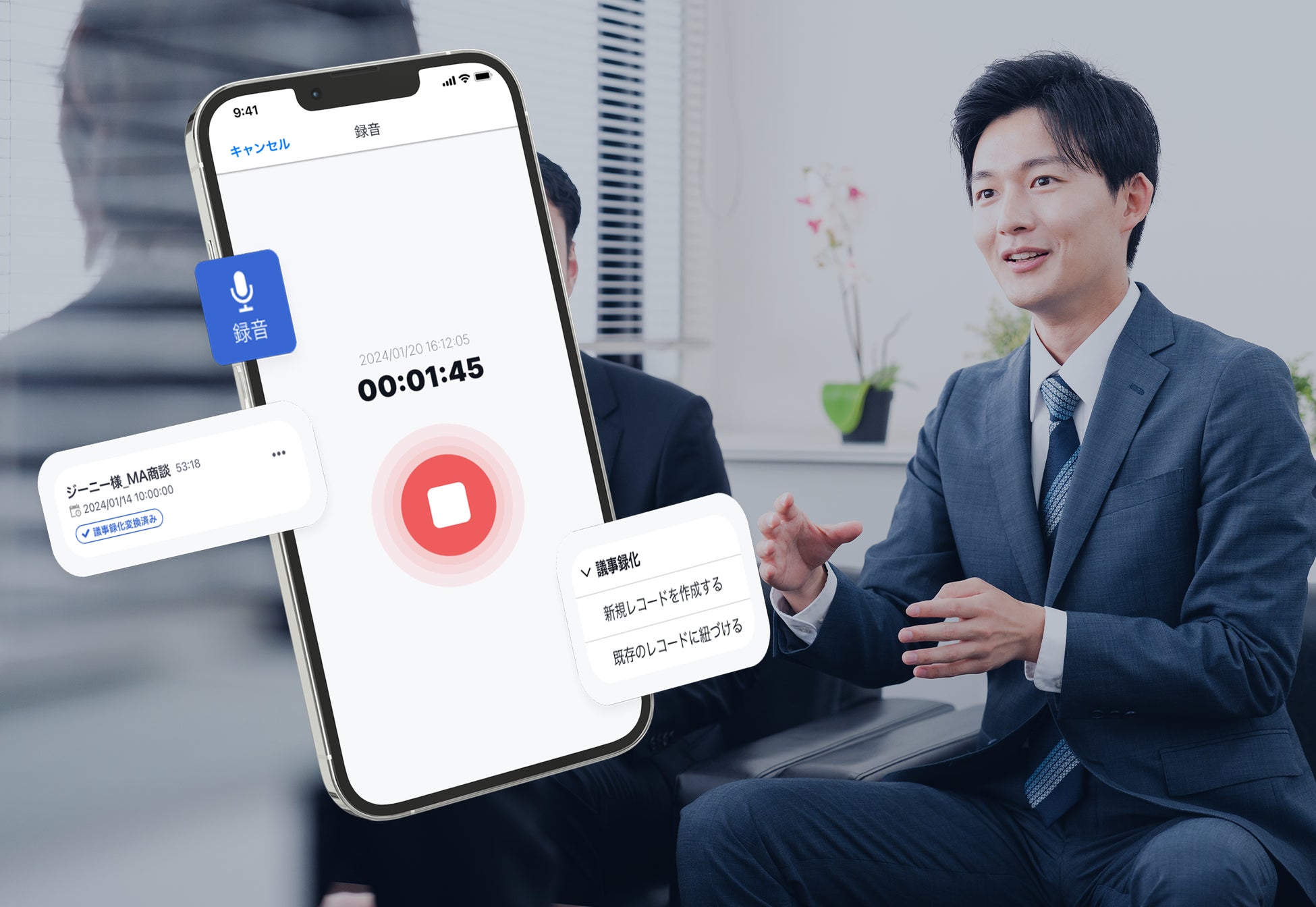 スマホのボイスレコーダー機能と連携して会議や商談の内容を自動で文字起こしし記録することができます。オフラインの営業活動、顧客との対面商談時でも、ニーズの取りこぼしやタスクの抜け漏れを防止したり、商談内容の報告の手間を削減したりすることができます。