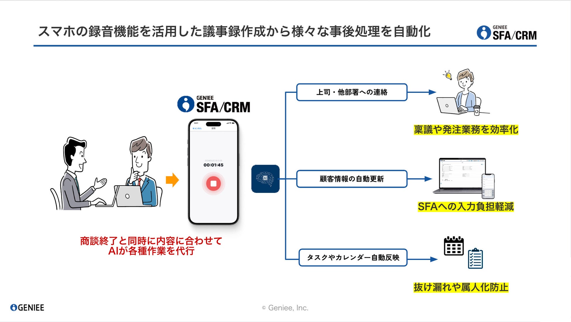株式会社ジーニー(本社:東京都新宿区、代表取締役社長:工藤 智昭、以下ジーニー)は、営業管理ツール「GENIEE SFA/CRM」のアプリ版をリニューアルし、AI連携やUI/UXの改善を実現しました。