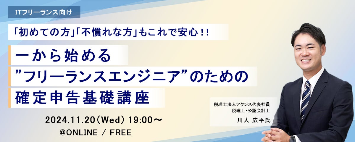 ITエンジニアの新しい働き方を提案する株式会社PE-BANK(東京都港区/代表取締役 髙田 幹也)は、2024年11月20日(水)19時より、ITフリーランスのためのオンラインセミナー、 『 「初めての方」「不慣れな方」もこれで安心!!一から始める”フリーランスエンジニア”のための確定申告基礎講座』を開催いたします。本ウェビナーはITフリーランス向け福利厚生サービス「サポートプラス」が主催するウェビナーで、今回で57回目の開催となります。