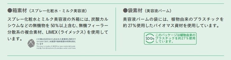 また、美容液バームの袋は、植物由来のプラスチックを約27%使用したバイオマス資材使用しています。