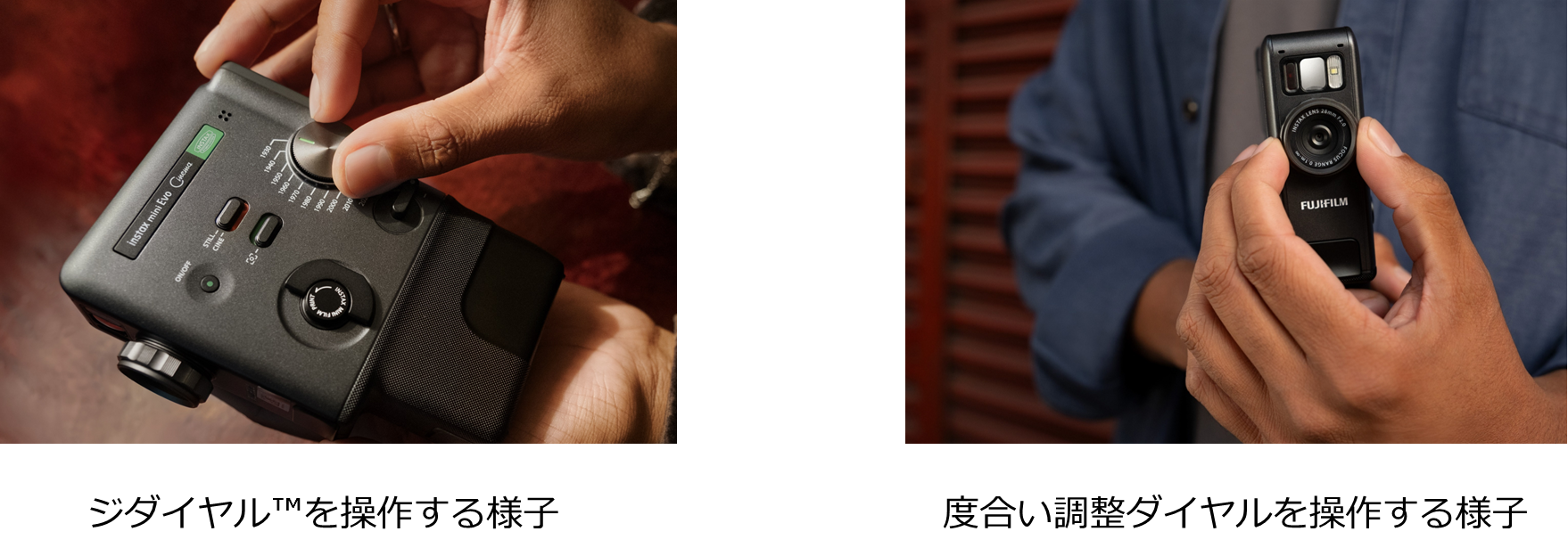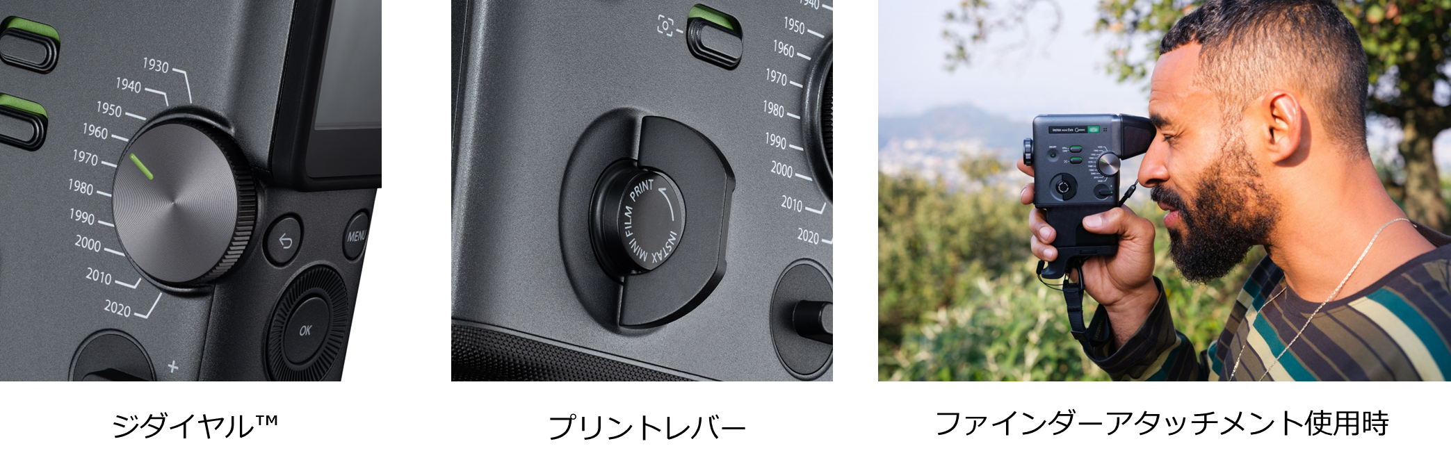 カメラ本体は、黒とグレーを基調にしたクラシックで高級感のあるデザインで、当社が1965年に発売し、誰でも簡単に日常を動画に残せる画期的なホームムービーシステムとして人気を博した8mmカメラ”フジカ シングル-8”を彷彿とさせる縦持ちスタイルを採用しました。指先に伝わるクリック感が魅力の「ジダイヤル™」や、フィルムを手で巻き上げるような感覚で操作できる「プリントレバー」など、細部にまでこだわったデザインとアナログな操作感で撮影とプリントの楽しみを広げます。