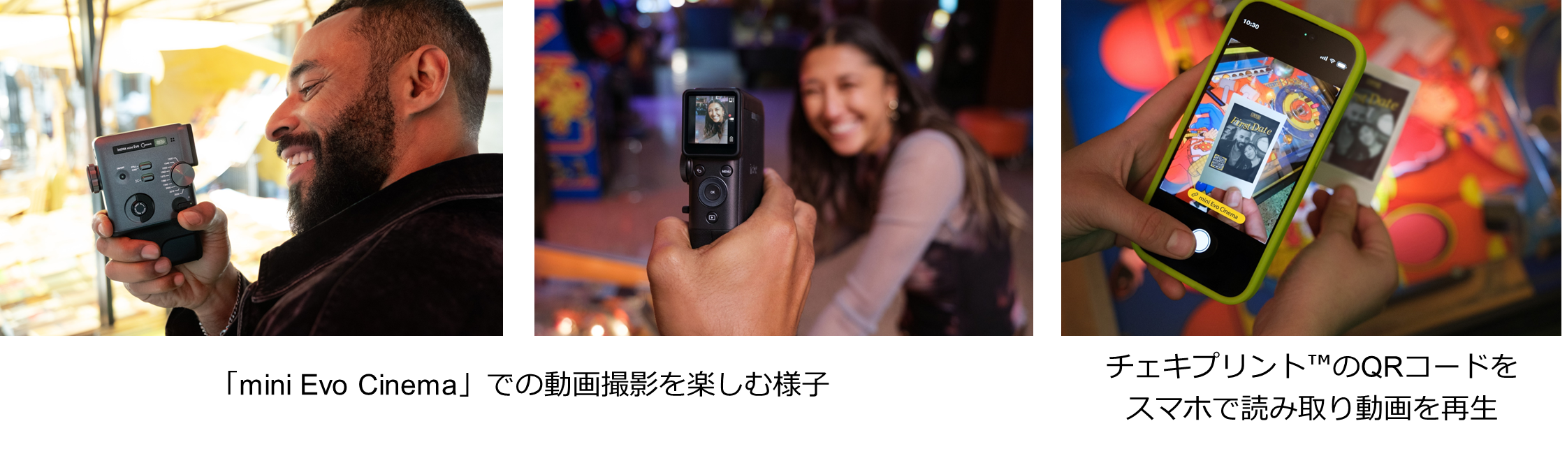 今回発売する「mini Evo Cinema」は静止画に加えて、動画の撮影が可能。撮影した動画データをQRコード(※1)化し、動画の中から切り出した静止画と一緒にチェキプリント™にして”動画を手渡せる”インスタントカメラです。動画をチェキプリント™にすることで、大切な人と過ごした様々なシーンをカタチにして残せるだけでなく、QRコードから動画をいつでも手軽に見返すことができます。