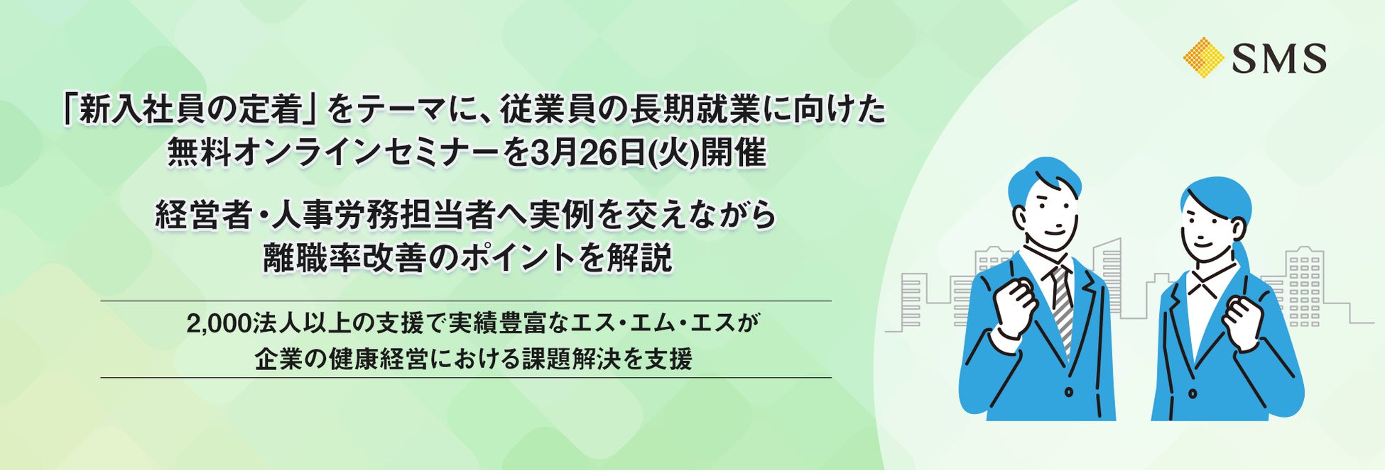 「新入社員の定着」をテーマに、従業員の長期就業に向けた無料オンラインセミナーを3月26日(火)開催。経営者・人事労務担当者へ実例を交えながら離職率改善のポイントを解説