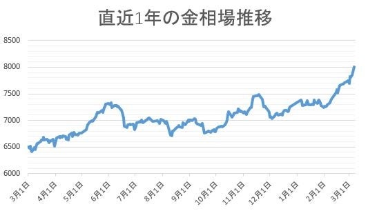 金買取相場8000円時代突入!-3月7日最高値到達-買取来店客倍増【ゴールドプラザ】