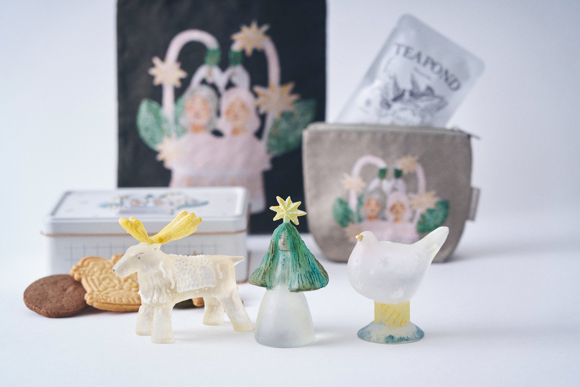 今年のクリスマスは、ガラス作家・安達知江さんとの特別なクリスマスコラボレーションをお届けします。テーマは『天使の祈り』。“希望”を花言葉にもつ「スノードロップ」のもとで双子の天使が星に願うガラス作品をモチーフにした『クリスマスビスケット缶』をはじめ、トートバッグセット、クリスマスポーチと紅茶のセットを展開いたします。安達知江さんのガラス作品が持つ繊細で静謐な優美さを表現した特別なクリスマス限定アイテムが揃います。