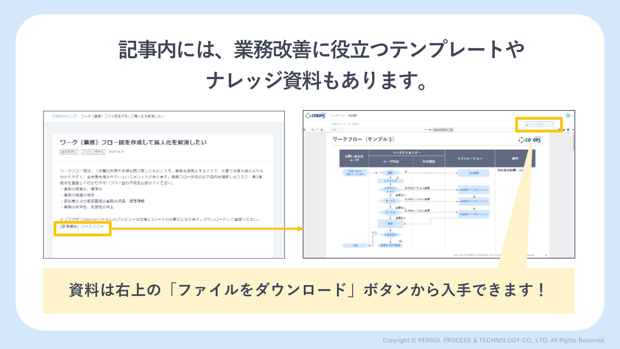 記事や動画を閲覧するだけでなく、業務改善に役立つテンプレートやナレッジ資料もご提供。チーム内での情報共有をスムーズに行うことができます。