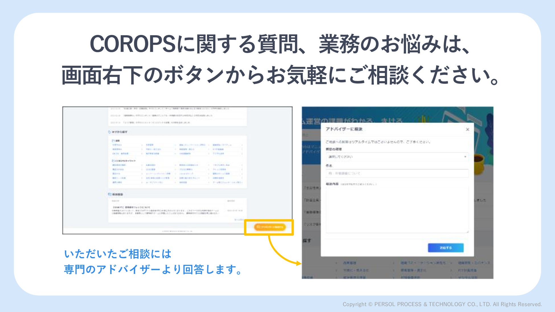 「COROPS」に関する質問、業務のお悩みは「アドバイザーに相談する」ボタンからご相談いただけます。いただいたご相談には、専門のアドバイザーが回答します。