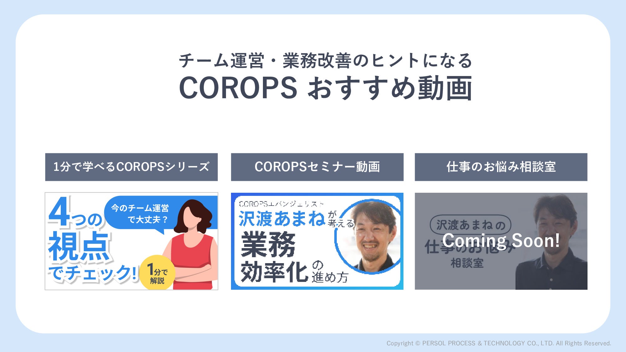 チーム運営や業務改善をテーマに、1分で学べるCOROPSの解説やセミナー動画などを公開しています。