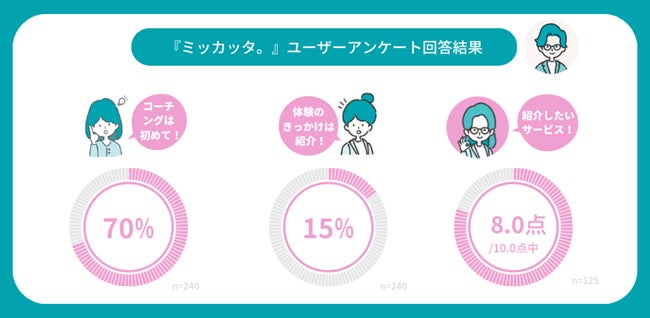 また、これまで紹介制度を設けていないにも関わらず、ユーザーが『ミッカッタ。』をご利用いただく動機のうち「知人・家族からの紹介」でのお申し込みが【15%】を超えています。コーチング体験後のユーザー満足度アンケートでも、「『ミッカッタ。』を友人・知人に勧めたいと思うか?」という項目に対して全体平均点で【8.0点/10.0点中】と、サービスのご紹介を前向きに考えていただけるユーザーが多いことがわかりました。