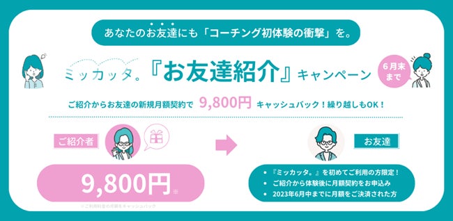 コーチングサービス『ミッカッタ。』で、9,800円のキャッシュバックがある「お友達紹介キャンペーン」を実施。(2023年6月末まで)