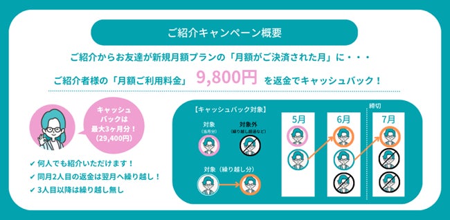 ・特典:お友達の新規月額契約でご紹介者様に9,800円をキャッシュバック