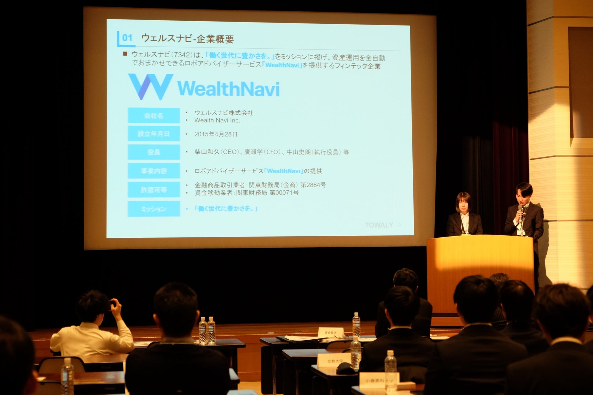 当社のプレゼンテーションは、一橋大学投資サークルTOWALYが担当しました。ロボアドバイザー事業の概要や収益モデル、成長戦略に関する分析を踏まえて、学生ならではの目線から新規事業も提言いただきました。