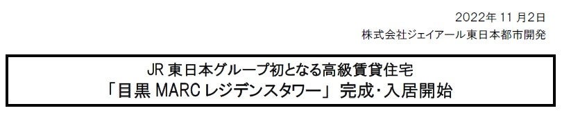 株式会社ジェイアール東日本都市開発(代表取締役社長:根本英紀)は 、「MEGURO MARCプロジェクト」の一環として「目黒MARCレジデンスタワー」の開発を進めておりましたが、このたび完成し、入居を開始いたしましたのでお知らせいたします。