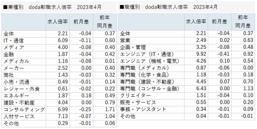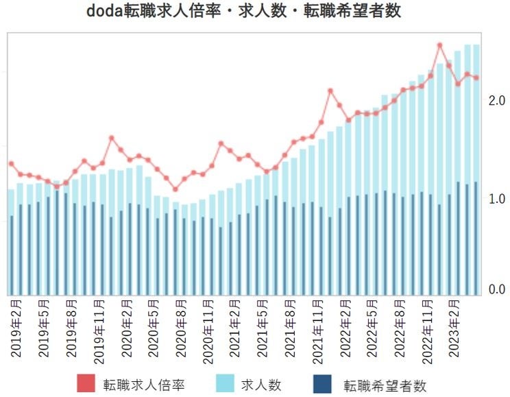 doda転職求人倍率2023年4月は2.21倍(前月差-0.04ポイント)