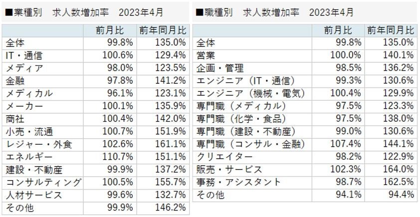 2023年4月の転職求人倍率は、前月から-0.04ポイントの2.21倍となりました。求人数は前月比99.8%、前年同月比135.0%となりました。転職希望者数は前月比101.5%、前年同月比112.5%でした。