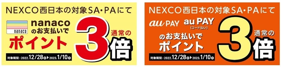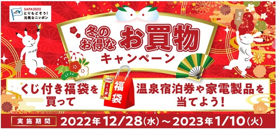 NEXCO西日本(大阪市北区、代表取締役社長:前川 秀和)と西日本高速道路サービス・ホールディングス株式会社(大阪市北区、代表取締役社長:川村 健一)は、今年度の年末年始に高速道路のサービスエリア(SA)・パーキングエリア(PA)でお客さまがお得にお楽しみいただける「冬のお得なお買い物キャンペーン」を開催いたします。お出かけの際は是非SA・PAにお立ち寄りください。