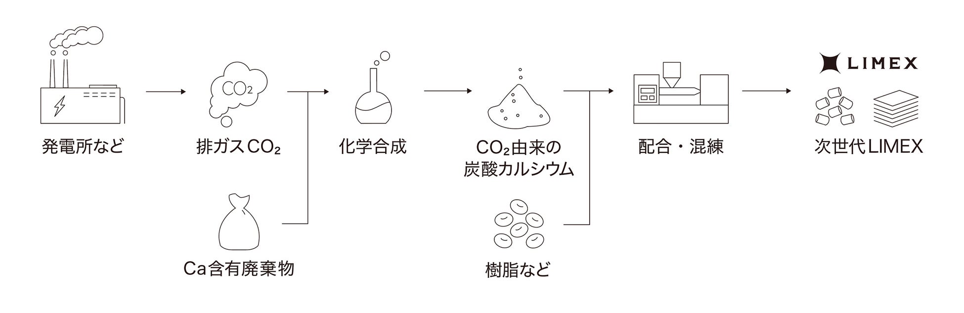 排出されるCO2を分離・回収し、多様な炭素化合物として再利用するカーボンリサイクル技術は、大気中へのCO2の排出を抑える重要な技術の1つとして、国内外で注目されています。次世代LIMEXは、石灰石を主原料とする従来のLIMEXで使用されていた鉱物由来の炭酸カルシウムを、排ガス由来の CO₂と、コンクリートスラッジや鉄鋼スラグなど工場から排出されるカルシウム含有廃棄物から、低環境負荷のプロセスで化学合成した炭酸カルシウムに置き換えることで、カーボンニュートラルへの貢献を推進する低炭素素材です。