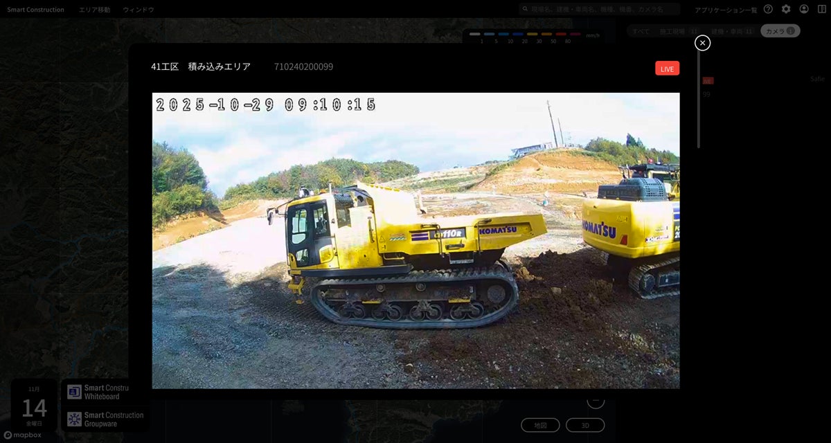 建設機械の稼働データと連動したカメラ映像を確認することで、工程の遅延やトラブルが発生した際でも、Smart Construction®上で即座に現場映像を確認でき、現場の状況共有や初動対応をスムーズに行うことが可能です。映像を通じて関係者間で同じ情報をリアルタイムに把握できるため、対応の精度とスピードを高めます。