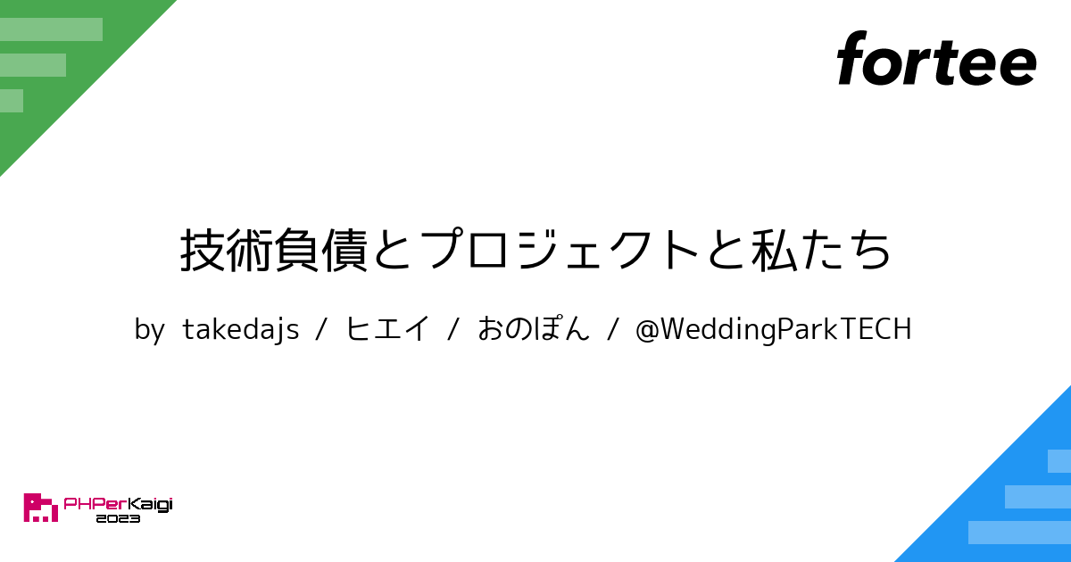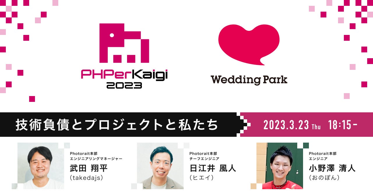 株式会社ウエディングパーク(本社:東京都港区、代表取締役社長:日紫喜 誠吾)は、プログラミング言語PHPに関する国内最大級のイベント「PHPerKaigi(ペチパーカイギ)2023」にシルバースポンサーとして協賛、3月23日に開催される前夜祭セッションでは、「技術負債とプロジェクトと私たち」というトークテーマで3名のエンジニアが登壇いたします。