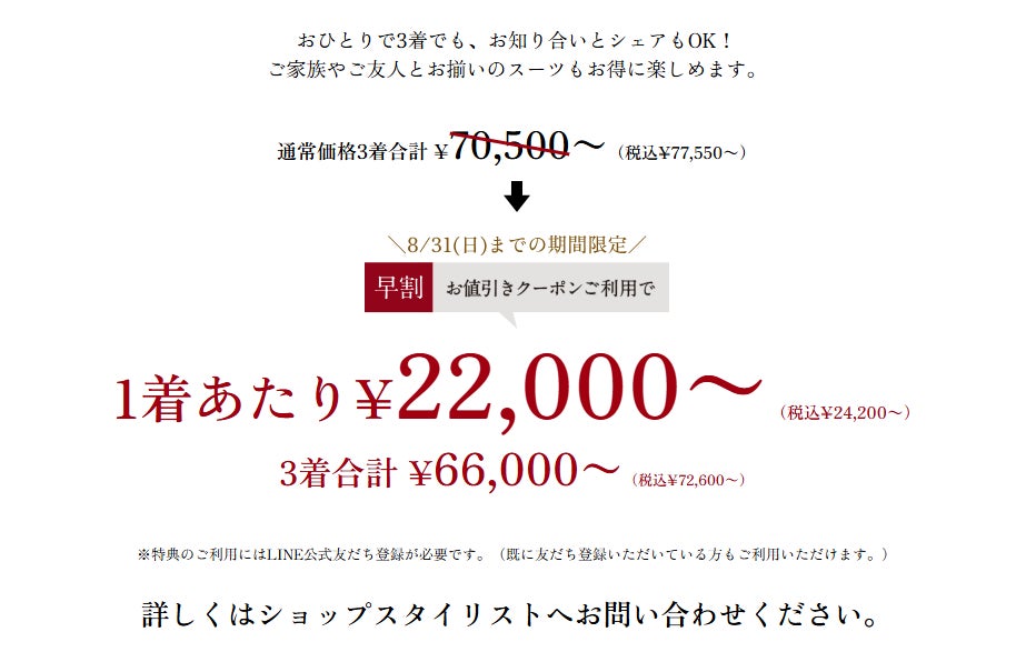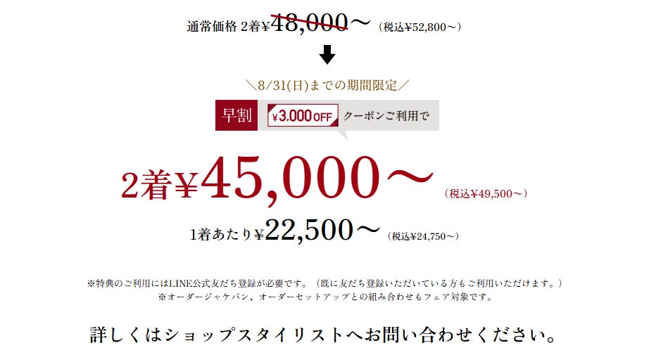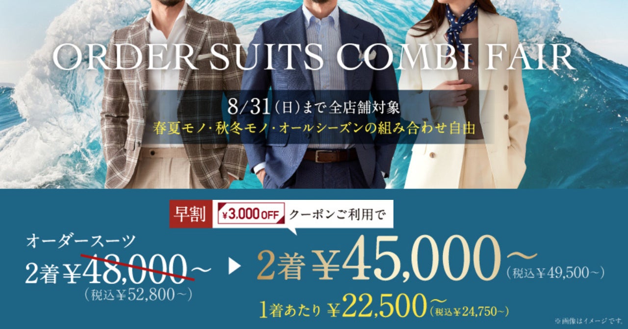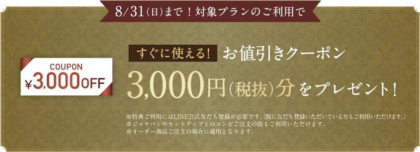 オーダースーツ専門店「グローバルスタイル」を運営するグローバルスタイル株式会社(東京証券取引所 スタンダード市場:7126、本社:大阪市中央区、代表取締役社長 田城弘志)は、対象プランのご利用で、本格オーダースーツ『3,000円OFF』早割クーポンをプレゼントするフェアを開催いたします。クーポンのご利用で1着あたり22,500円~(税込24,750円~)ご購入いただけます。フェアは8月4日(月)から8月31日(日)までの期間限定、全店舗対象です。