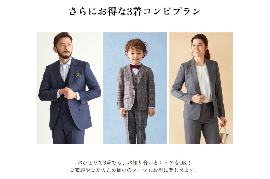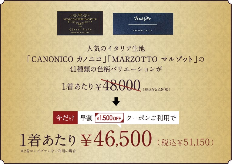 ※コンビプランとは・・・オーダースーツ2着以上ご購入していただいた場合の1着あたりのお値段です。組み合わせは自由ですので、異なる価格帯のオーダースーツと組み合わせていただいても本価格が適用されます。