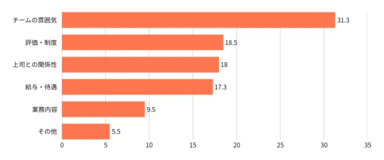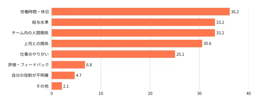 若手社員の約6割が離職を身近に感じており、その理由は「労働時間・休日」に次いで「チーム内の人間関係(33.19%)」が「給与水準」と並ぶ結果となりました。