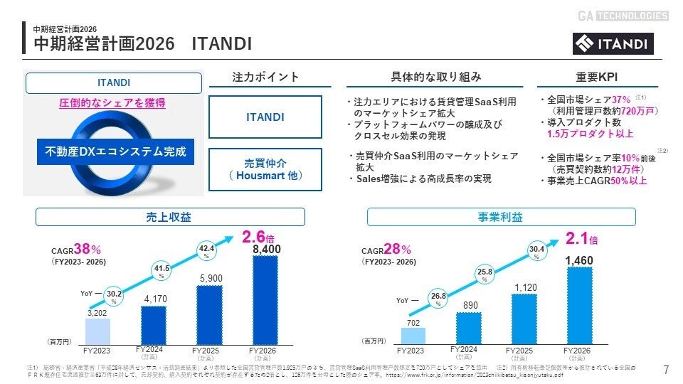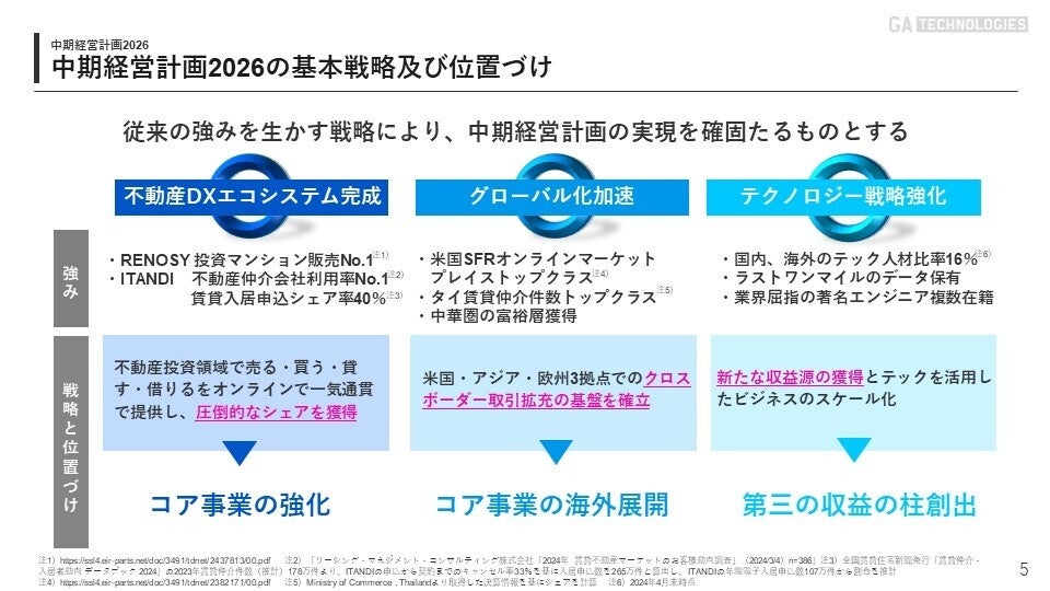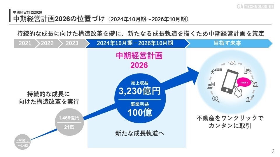 この度、この構造改革を礎に、新たなる成長の航路を描くべく「中期経営計画 2026」を策定いたしました。 本「中期経営計画 2026」では、「不動産をワンクリックでカンタンに取引」を未来のビジョンとして掲げ、既存の強みを最大限に生かした戦略で、当社の競争優位性をさらに強化し、高い売上収益成長と利益成長の両立を実現し、企業価値の向上を目指してまいります。