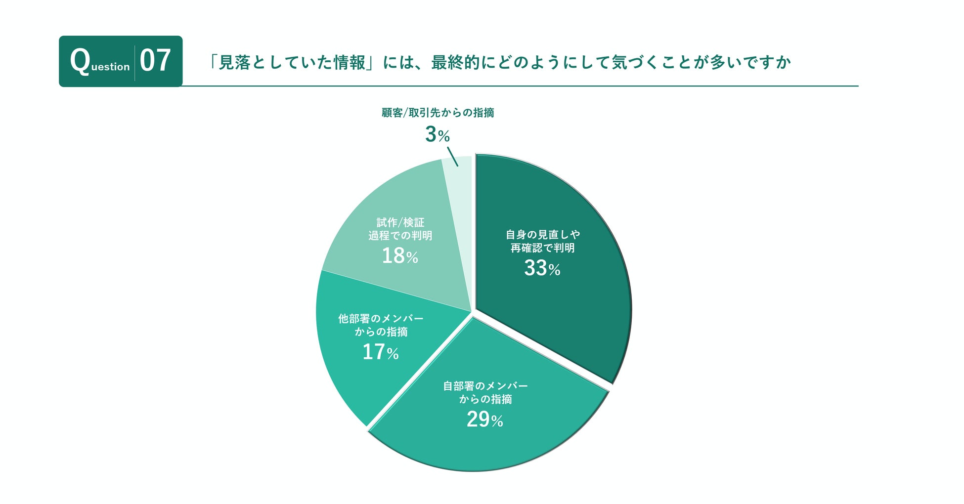 更に、手戻りの原因となった情報の見落としはどこで発覚したかについて尋ねたところ、自身の見直しによる発覚は33%に留まり、約7割が自身の手を離れた第3者による指摘によって発覚していることが明らかになりました。