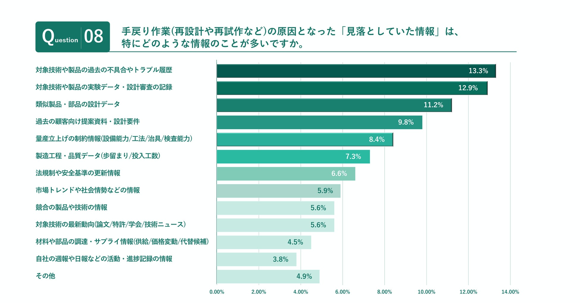 どのような情報の見落としにより手戻りが発生したかについて尋ねたところ、「過去の不具合・トラブル履歴」「実験・設計データの記録」「類似製品・部品の設計データ」といったデータが多く、過去の社内ナレッジが活用できていないことに加え、他部門や外部情報との接続が機能していない実態が明らかになりました。