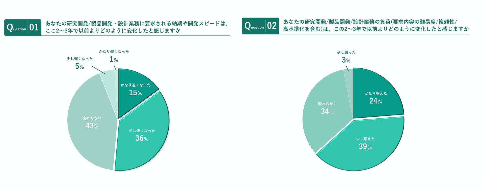 – 研究開発/製品開発・設計業務の負荷が「増加した」と回答した人は63%にのぼる。