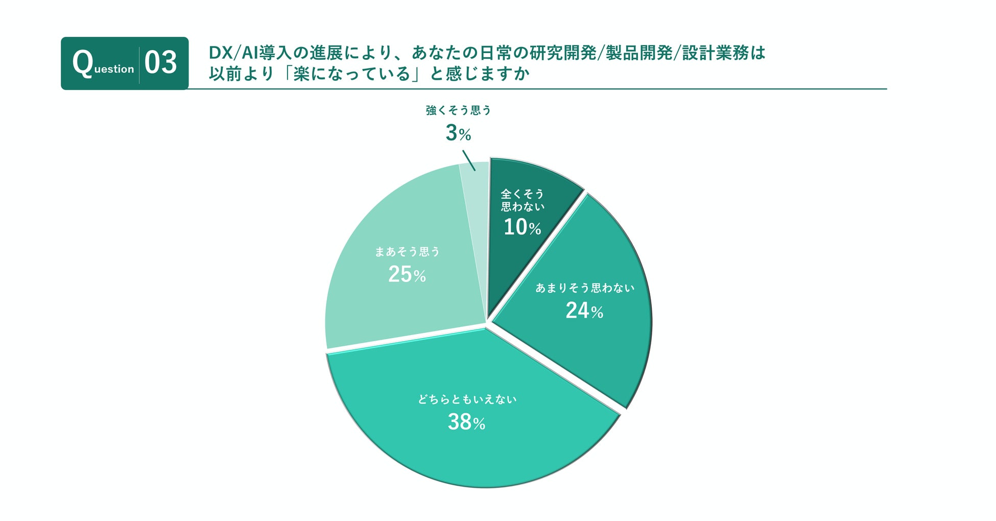 一方で、こうした状況を打開するために各社で進むDXやAI導入の効果については、72%が「業務が楽になった実感がない」と回答しています 。急速に進化する生成AI技術やそれらを活用したデジタルツールの導入が積極化する一方で、前述したような複雑に絡み合う情報を「現場が使いこなせる状態」には至っておらず、負荷軽減という成果には結びついていない現状が浮き彫りとなりました。