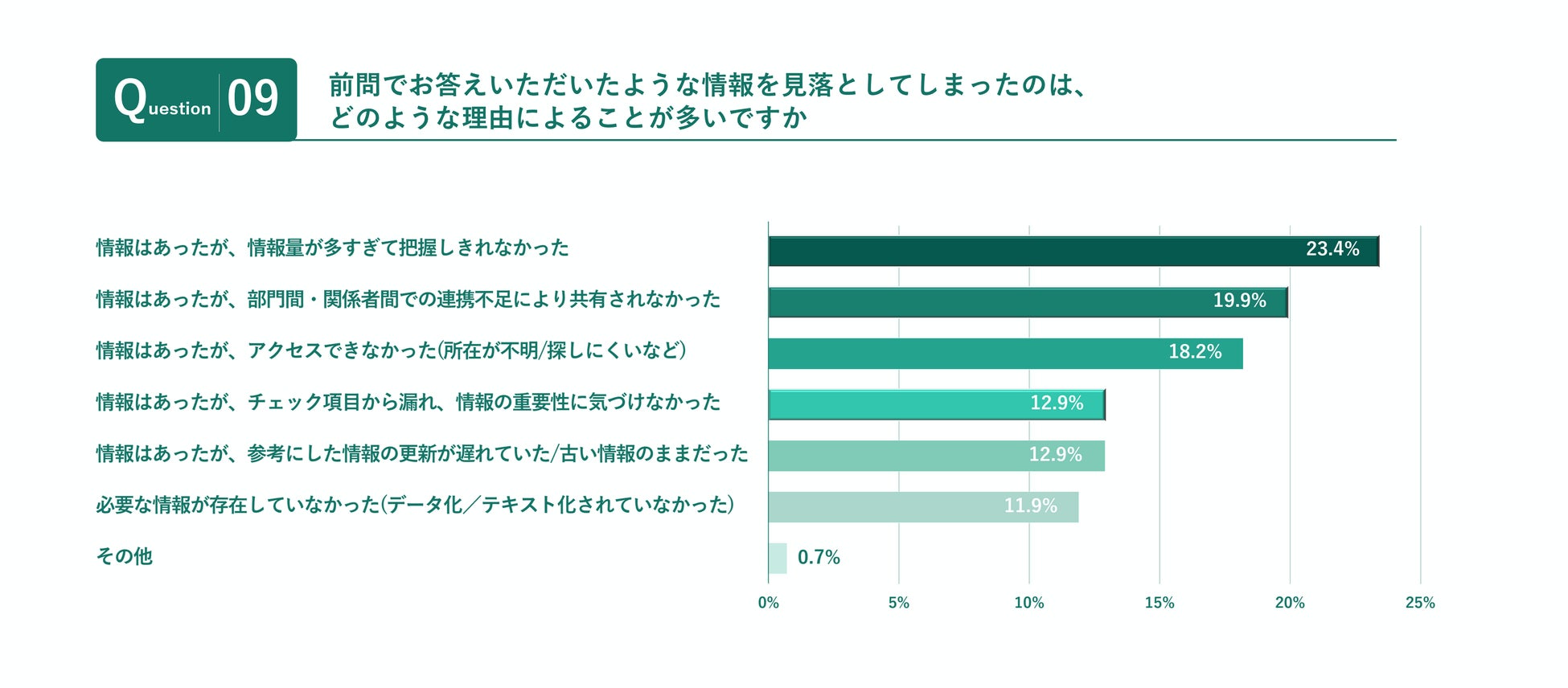 更に情報を見落としてしまった原因について尋ねたところ、情報自体が存在していないケースは約12%に留まり、約75%が情報は存在するが「情報が多すぎて見つけられなかった」「共有/連携されていなかった」など、手戻りの原因となる情報見落としの殆どが「情報過多」や「活用不全」に起因している実態が明らかになりました。