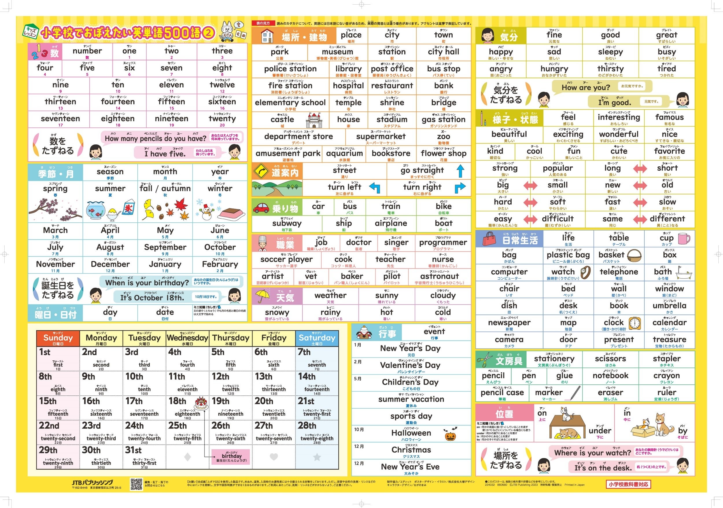 小学校から始まる英語の授業に対応した、すぐに使える名詞、動詞、形容詞など基本の英単語500語をジャンル別にセレクトしました。
