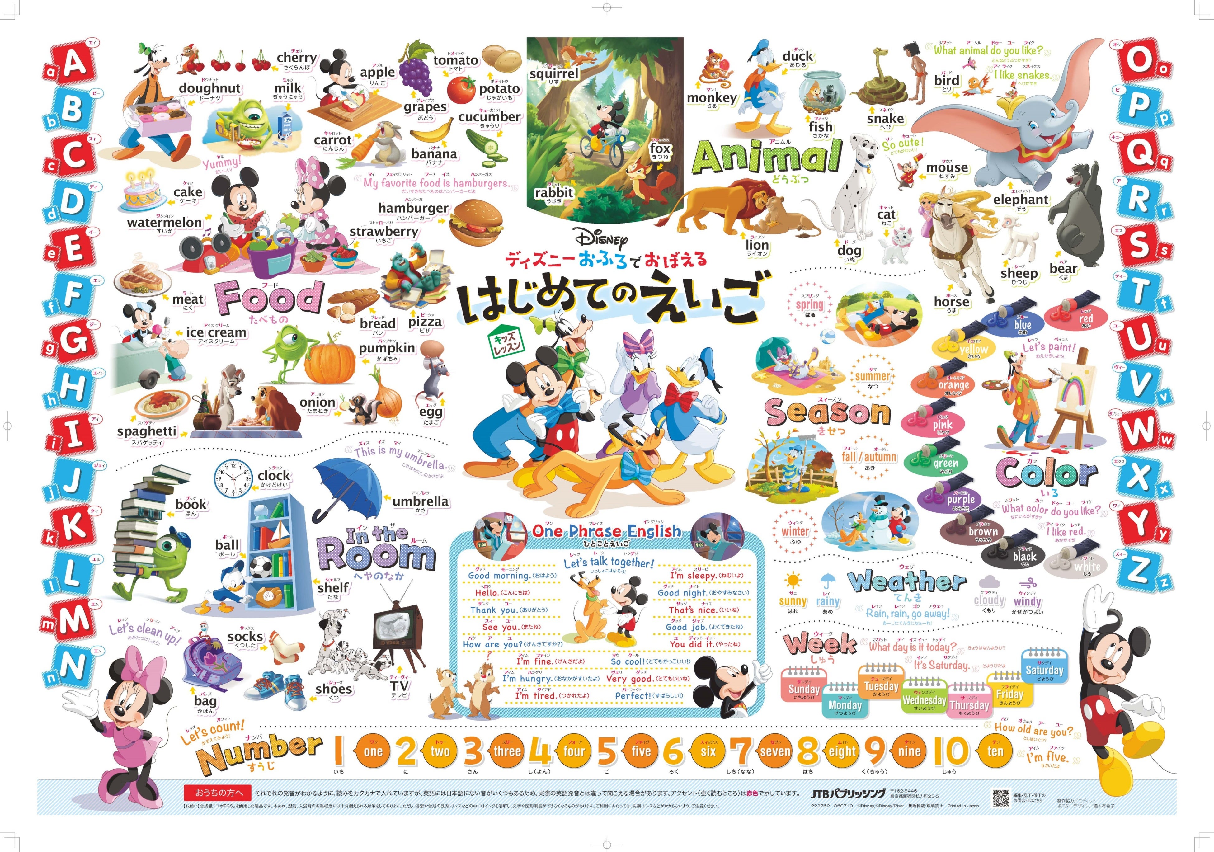 ディズニーの仲間たちと一緒に、食べ物や動物、天気、1から10など、身近な単語80語以上を楽しく覚ええられるかわいいポスターです。