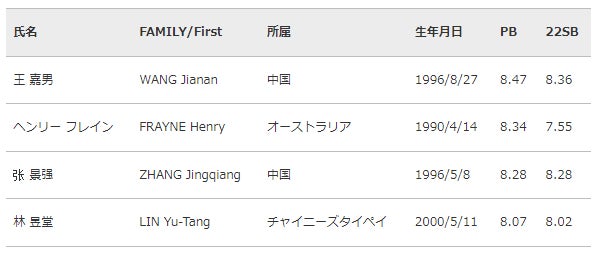 金メダリスト 王 嘉男(中国)の自己記録は日本記録を上回る8m47。同大会では最終6回目の跳躍で逆転優勝を果たしたように勝負強い跳躍が持ち味。ドーハ2019世界選手権、東京2020オリンピック入賞の橋岡優輝(富士通)との熾烈なトップ争いからは目が離せません。