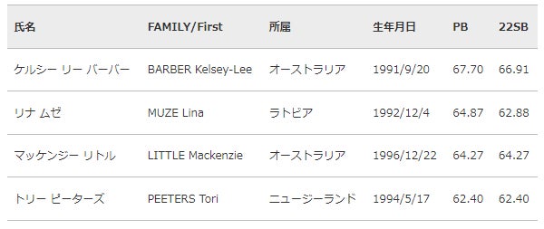 金メダリスト ケルシー・リー・バーバー(オーストラリア)は昨年に続き出場。銅メダリスト 北口榛花(JAL)や同大会5位のマッケンジー・リトル(オーストラリア)、6位のリナ・ムゼ(ラトビア)による、世界大会の決勝を彷彿とさせる60mオーバーの投擲は必見です。