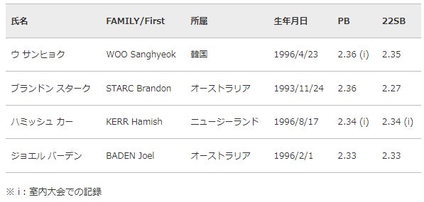 銀メダリスト ウ・サンヒョク(韓国)は自己記録2m36、東京2020オリンピックでも4位入賞と国際舞台での実績は十分。同大会8位で自己記録2m31の真野友博(九電工)との2m30を超えるハイレベルな空中決戦が期待されます。