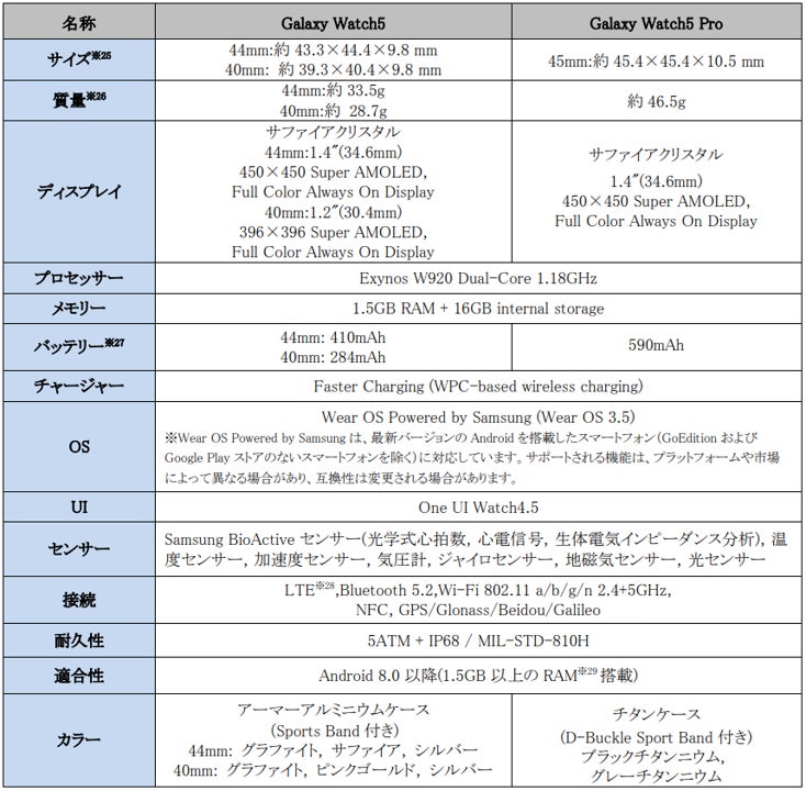 <「Galaxy Watch5」/「Galaxy Watch5 Pro」の主な仕様>※23※24